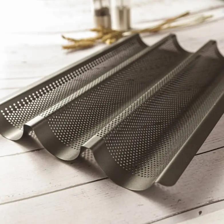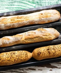 Wundermix sorgt dafür, dass das Baguette beim Backen gut in Form bleibt. Das Baguetteblech bietet Platz für 3 Baguettes. Dank der perforierten Oberfläche der Form kann sich die Hitze gleichmäßig verteilen. Außerdem wird durch die Lochung der Teig während des Backvorgangs besser mit Sauerstoff versorgt, sodass er zum einen weiter aufgehen kann und sich zum anderen eine gleichmäßige krosse Kruste bilden kann.