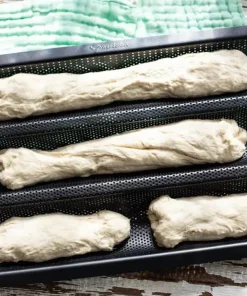 Dank der Antihaftbeschichtung lassen sich die fertigen Baguettes ohne vorheriges Einfetten des Blechs einfach wieder herauslösen. Auch Backpapier wird nicht mehr benötigt.