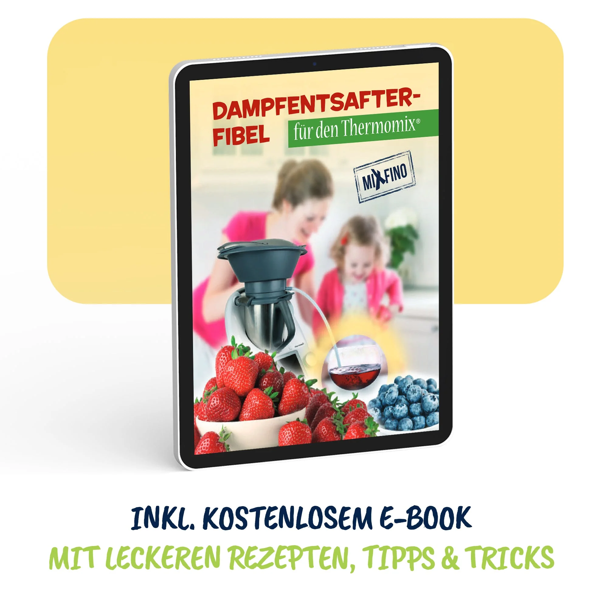 Mit dem MixFino Dampfentsafter-Aufsatz kann Dein TM7 nun auch dampfentsaften: Ganz ohne Umfüllen, ohne großen Aufwand und mit maximaler Saftausbeute. Du platzierst einfach biszu zwei Kilogramm Obst oder Gemüse im Varoma, startest die Dampfgaren-Funktion und der Saft fließt durch den Schlauch direkt in das Gefäß Deiner Wahl. So bleibt der lecker-fruchtige Geschmack mit allen wertvollen Vitaminen, Aromen und Mineralstoffen erhalten. Perfekt für Gelees, Sirups, Likören oder einen frischen Saft. Gratis dazu erhältsts Du eine 87-seitige Rezept-Fibel mit über 40 erprobten Rezepten.