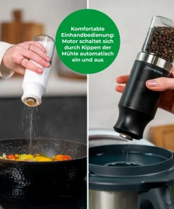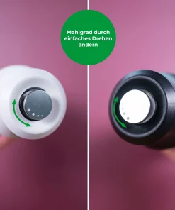 - Knopflose Bedienung – einfach die Mühle umdrehen zum automatischen Aktivieren