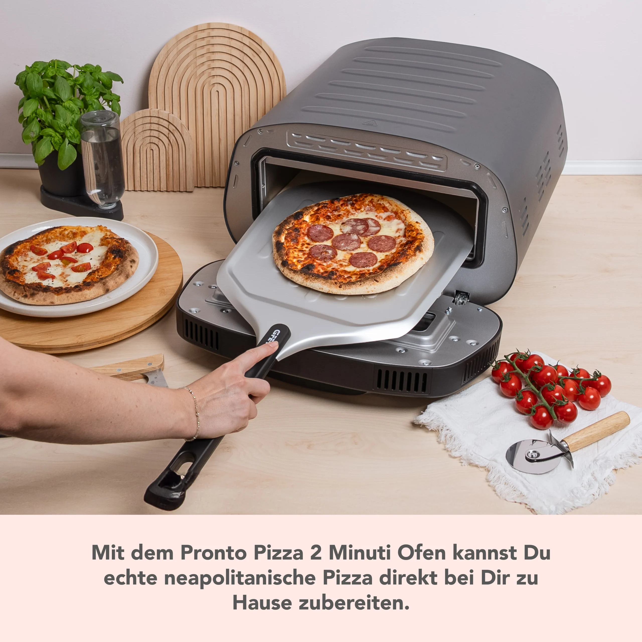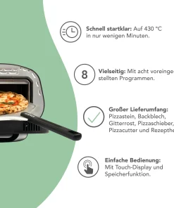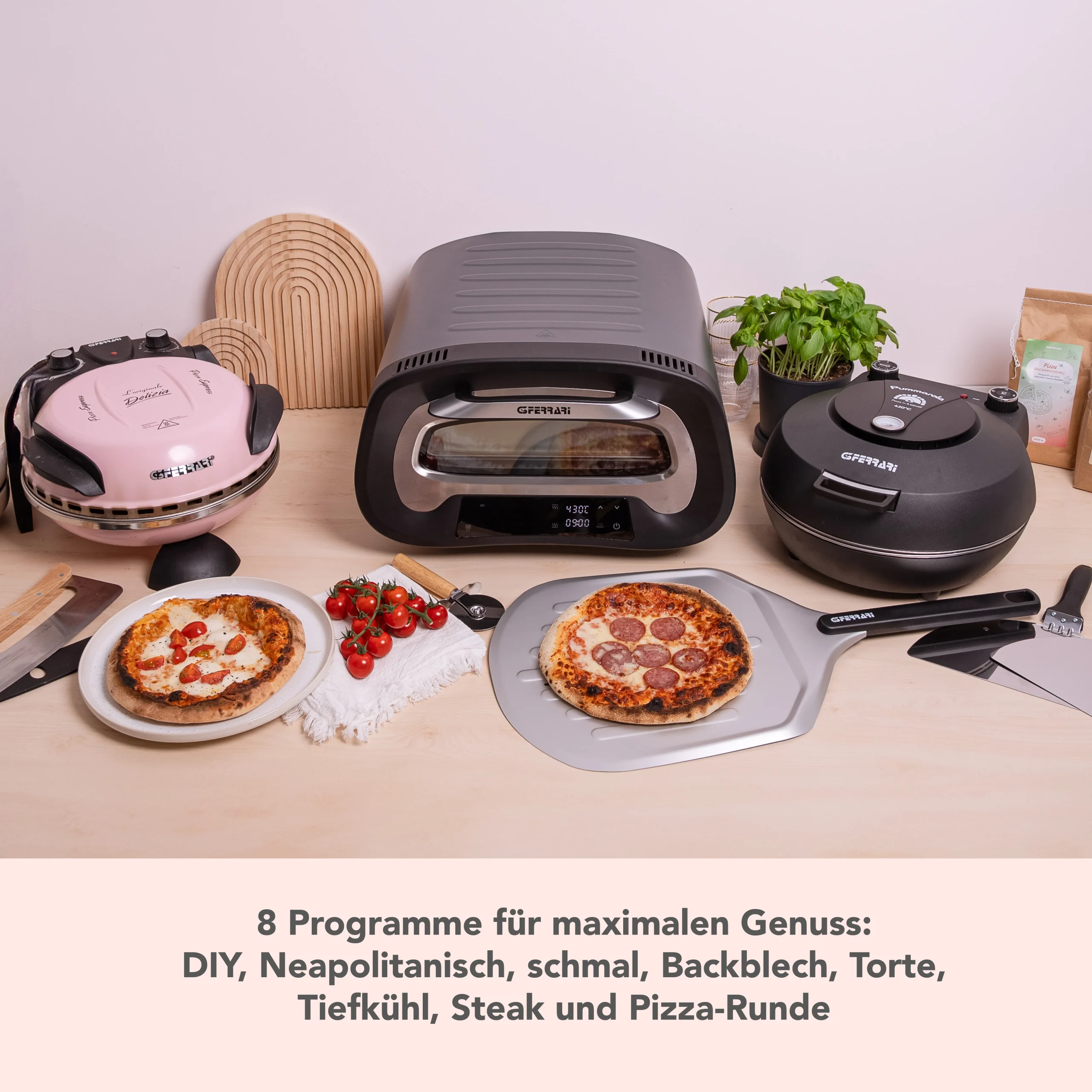 Hole Dir echtes Pizzeria-Feeling direkt in Deine Küche! Mit dem digitalen G3Ferrari Multifunktions-Pizzaofen PRONTO PIZZA gelingen Dir knusprige, goldbraune Pizzen in nur zwei Minuten dank 430 °C Ober- und Unterhitze. Acht voreingestellte Programme, ein intuitives Touchdisplay, Speicherfunktion und umfangreiches Zubehör machen ihn zum Allroundtalent für Pizza, Flammkuchen, Brötchen, Kuchen, Fleisch und mehr.