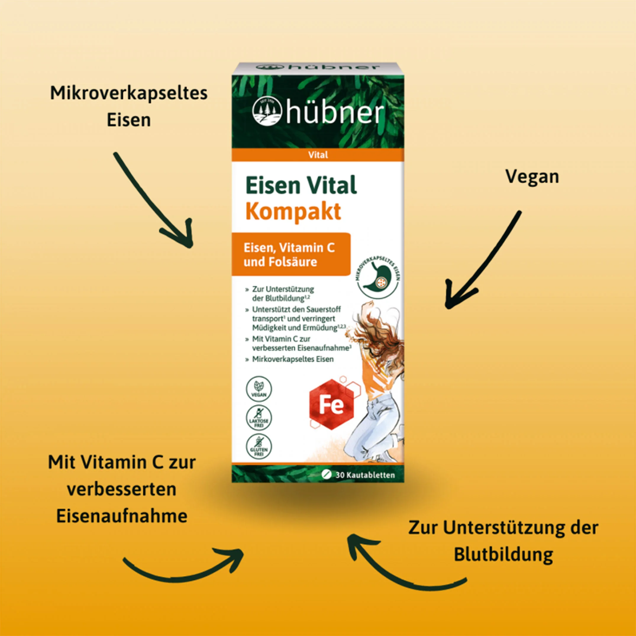 In reiner Form kann es aber die Magenwände reizen. Deshalb liegt das Eisen bei den Kautabletten in mikroverkapselter Form vor. Damit wird es vorwiegend erst im oberen Dünndarm freigesetzt. Ergänzend enthalten die Kautabletten Vitamin C und Folsäure.