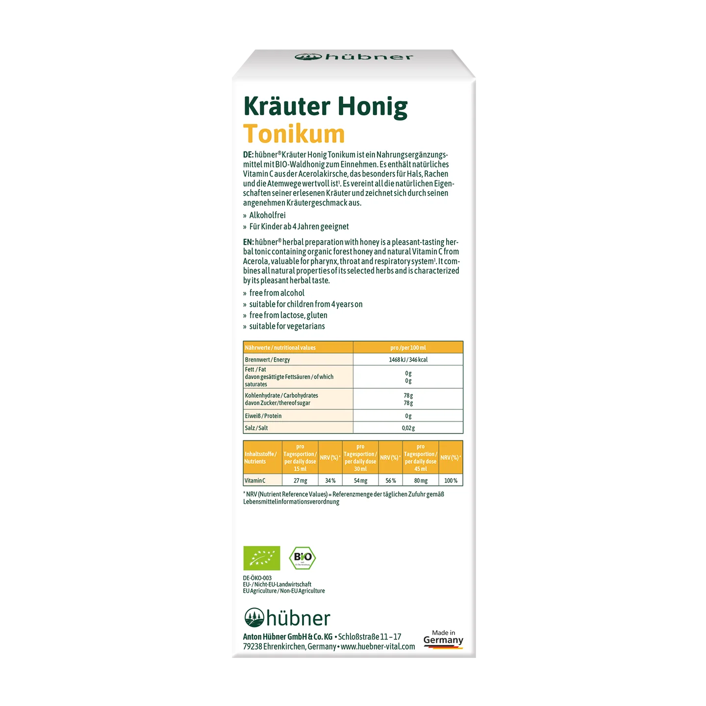 hübner® Kräuter Honig Tonikum ist ein Nahrungsergänzungsmittel mit BIO-Waldhonig zum Einnehmen. Es enthält natürliches Vitamin C aus der Acerolakirsche, das besonders für Hals, Rachen und die Atemwege wertvoll ist*. Außerdem enthält es ätherische Öle aus Kräutern und Ingwer für das allgemeine Wohlbefinden. Das Tonikum vereint all die natürlichen Eigenschaften seiner erlesenen Kräuter und zeichnet sich durch seinen angenehmen Kräutergeschmack aus.