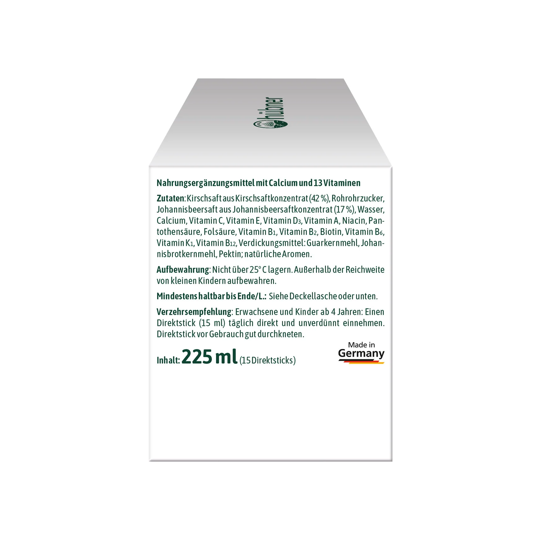 Kirschsaft aus Kirschsaftkonzentrat (42 %), Rohrohrzucker, Johannisbeersaft aus Johannisbeersaftkonzentrat (17 %), Wasser, Calcium, Vitamin C, Vitamin E, Vitamin D3, Vitamin A, Niacin, Pantothensäure, Folsäure, Vitamin B1, Vitamin B2, Biotin, Vitamin B6, Vitamin K1, Vitamin B12, Verdickungsmittel: Guarkernmehl, Joannisbrotkernmehl, Pektin; natürliche Aromen.