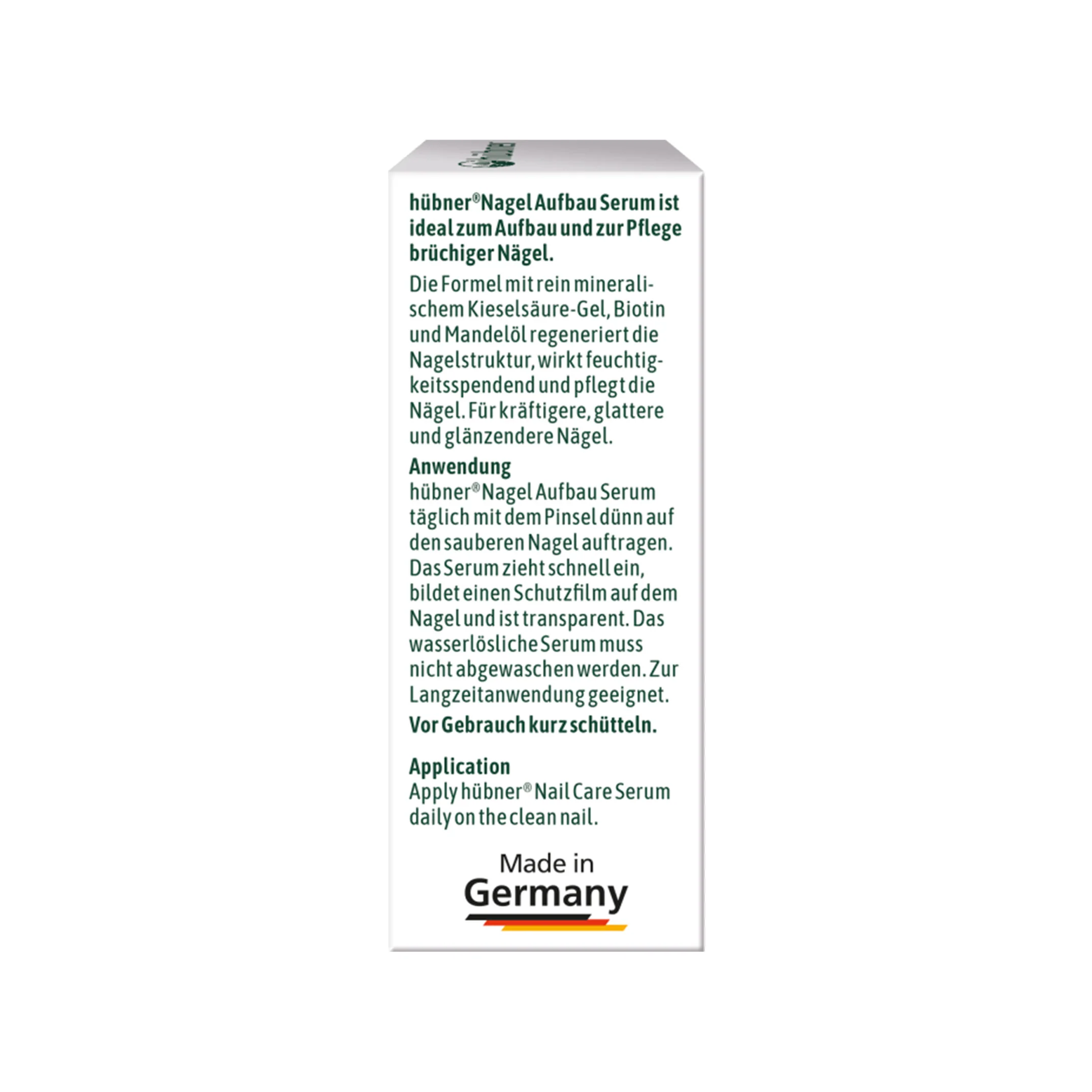 Bei 80 % der Anwender/innen führt das hübner® Nagel Aufbau Serum zu einem verbesserten Erscheinungsbild der Nägel. Das vegane Nagelaufbauserum sorgt für eine Regeneration von brüchigen Nägeln und die Nagelstruktur wird glatter, glänzender und splittert weniger.