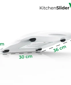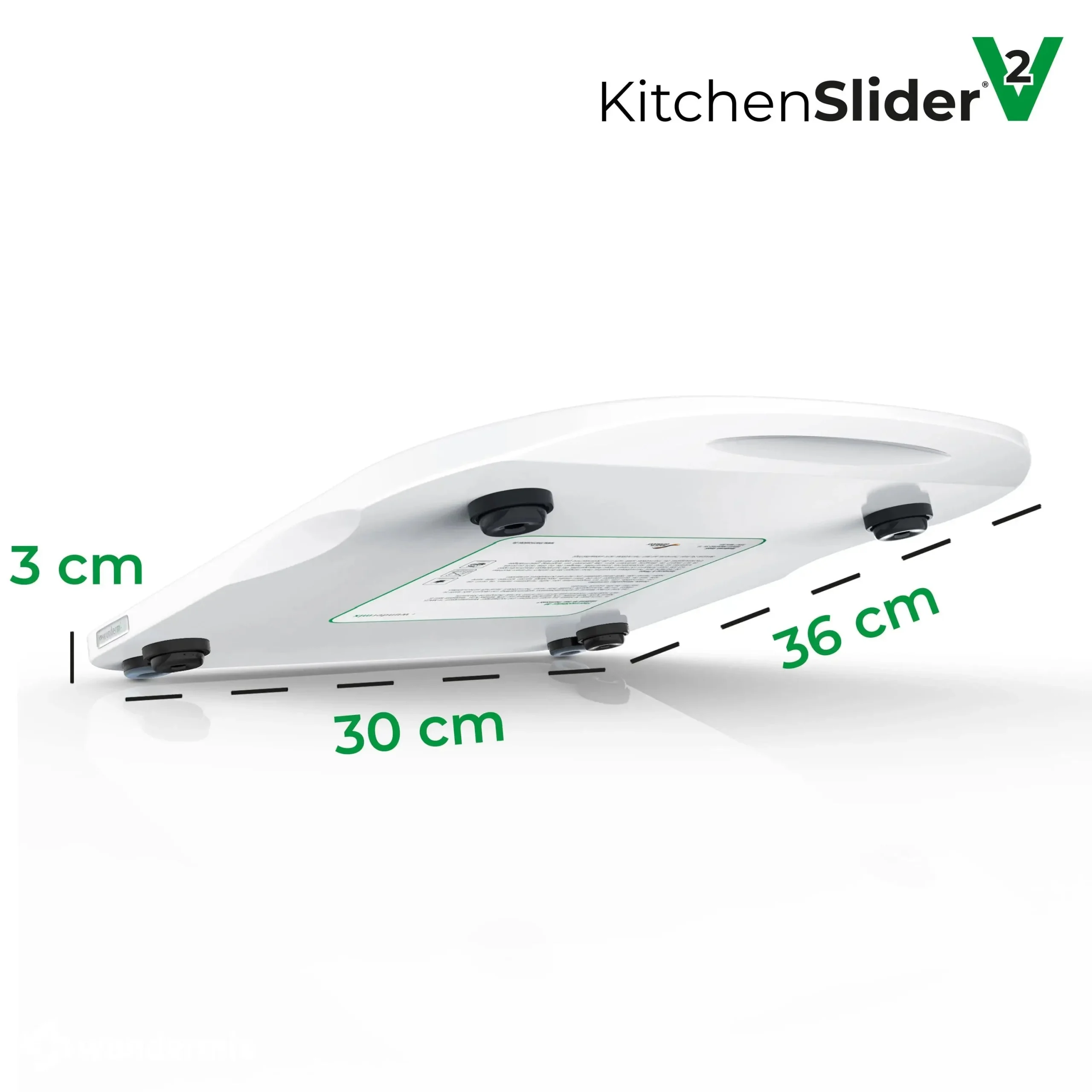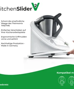 Mit dem KitchenSlider V2 Plus aus Mineralwerkstoff bewegst Du Deinen Thermomix sicher und bequem, wo Du ihn brauchst, und schonst gleichzeitig die empfindliche Waage. Die abgeschrägte Vorderseite sorgt für einfachen Grip, während seitliche Griffmulden helfen, kleine Hindernisse wie eine Kochfeldumrandung zu überwinden.