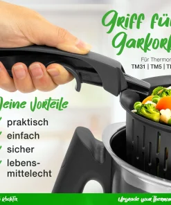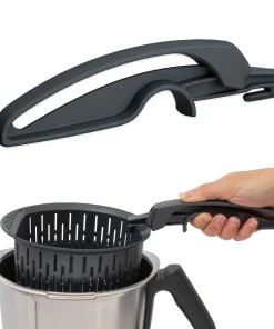 Dank des sanften Zusammendrückens des innovativen Zangengriffs ist der Thermomix Garkorb beim Entnehmen stets sicher fixiert und kann nicht versehentlich herausfallen. Dadurch werden Unfälle und Missgeschicke in der Küche effektiv vermieden.
