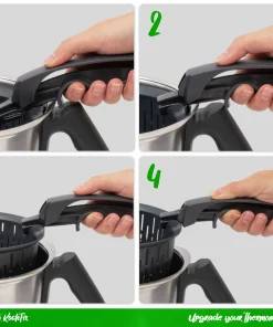 Die wegweisende Innovation von KochFix, der einzigartige Zangengriff, ist das perfekte Accessoire für müheloses und sicheres Entnehmen, Halten und Entleeren des Thermomix Gareinsatzes und ist kompatibel mit den Modellen TM7, TM6, TM5 und TM31.