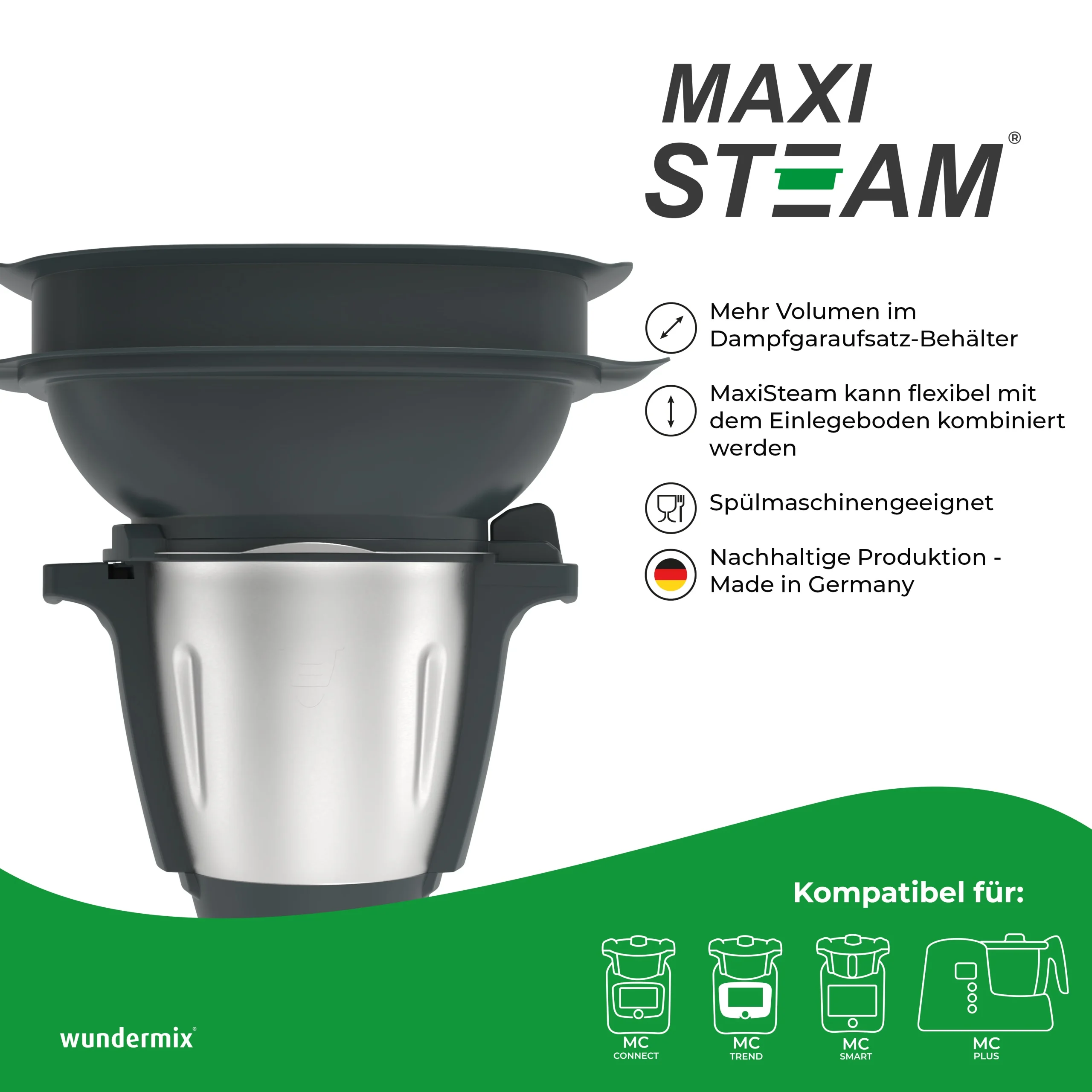 Tipp vom Wundermix-Team: Wenn Ihr unseren neuen MaxiSteam zusammen mit dem Dampfgar-Kamin WunderSteam verwendet, könnt Ihr z.B. Beilagen-Gemüse für bis zu 8 Personen auf einmal dämpfen. Denn während der MaxiSteam mehr Platz schafft, sorgt der WunderSteam dafür, dass der heiße Dampf zirkulieren kann und dadurch die kompletten Zutaten im Dampfgaraufsatz gleichmäßig – trotz größerer Menge – gar werden.