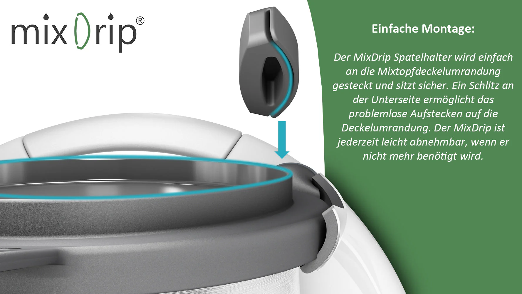Mit dem MixDrip Spatelhalter bleibt Deine Arbeitsfläche sauber und aufgeräumt. Einfach am Deckel Deines Thermomix aufgesteckt, lässt er Soßen und Flüssigkeiten direkt zurück in den Mixtopf tropfen. So vermeidest Du Kleckereien und hast Deinen Spatel immer griffbereit.