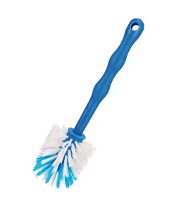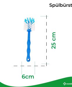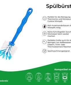 Die Reinigungsbürste für den Mixtopf hat einen Kunststoffgriff und einen Bürstenkopf mit robusten Nylonborsten. Diese sind so ausgerichtet, dass sie jede Stelle des Mixtopfes gut erreichen können. So wird verhindert, dass hartnäckige Speisereste am Boden des Mixtopfes haften bleiben.