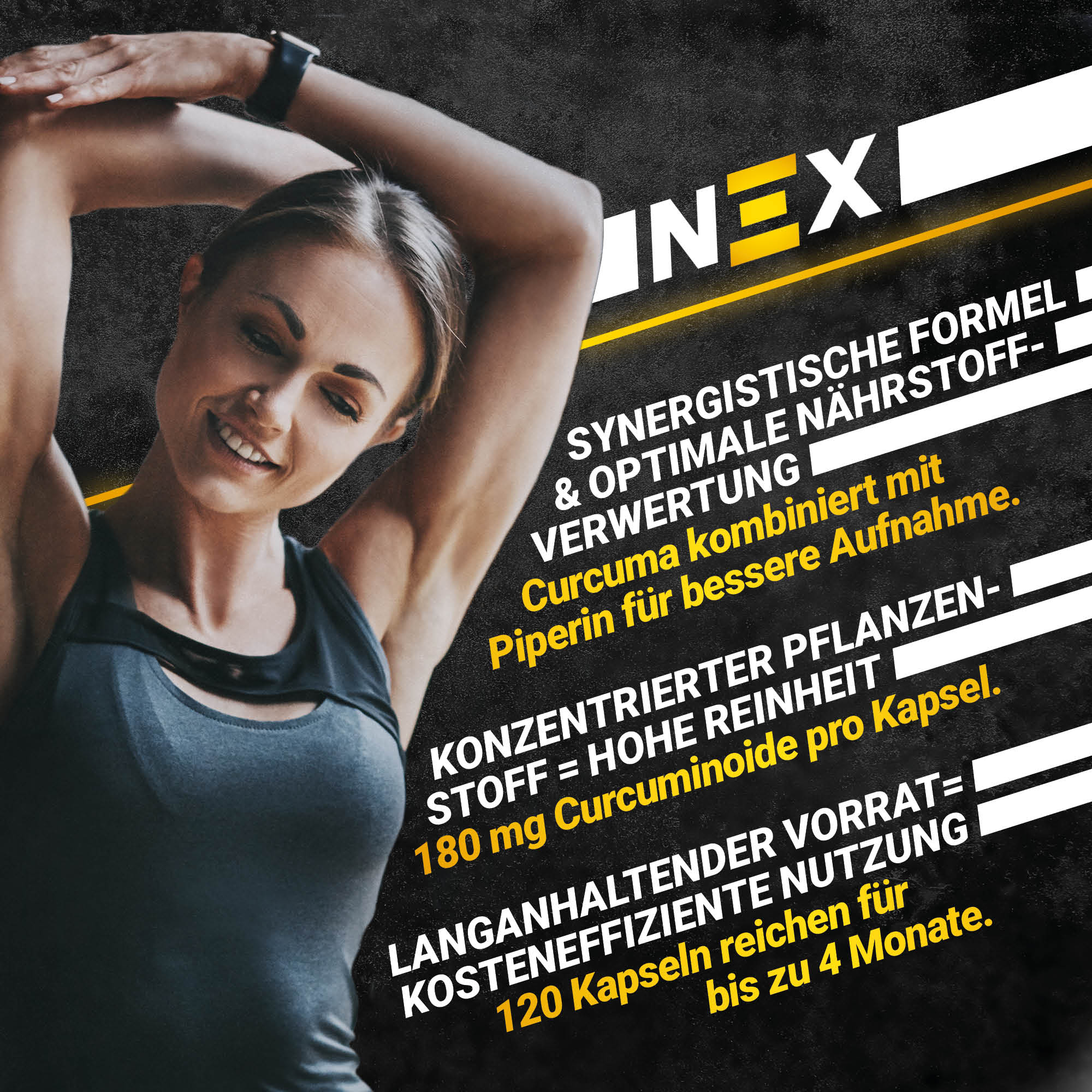 NEX Curcuma Pro liefert dir 180 mg dieser Inhaltsstoffe in standardisierter Qualität – ergänzt mit 2 mg Piperin aus Schwarzem Pfefferextrakt pro Kapsel. Diese Kombination ist aus ernährungswissenschaftlicher Sicht sinnvoll gewählt, da Curcumin als fettlöslicher Pflanzenstoff alleine nur eingeschränkt vom Körper aufgenommen werden kann. Piperin rundet die Zusammensetzung funktionell ab.
