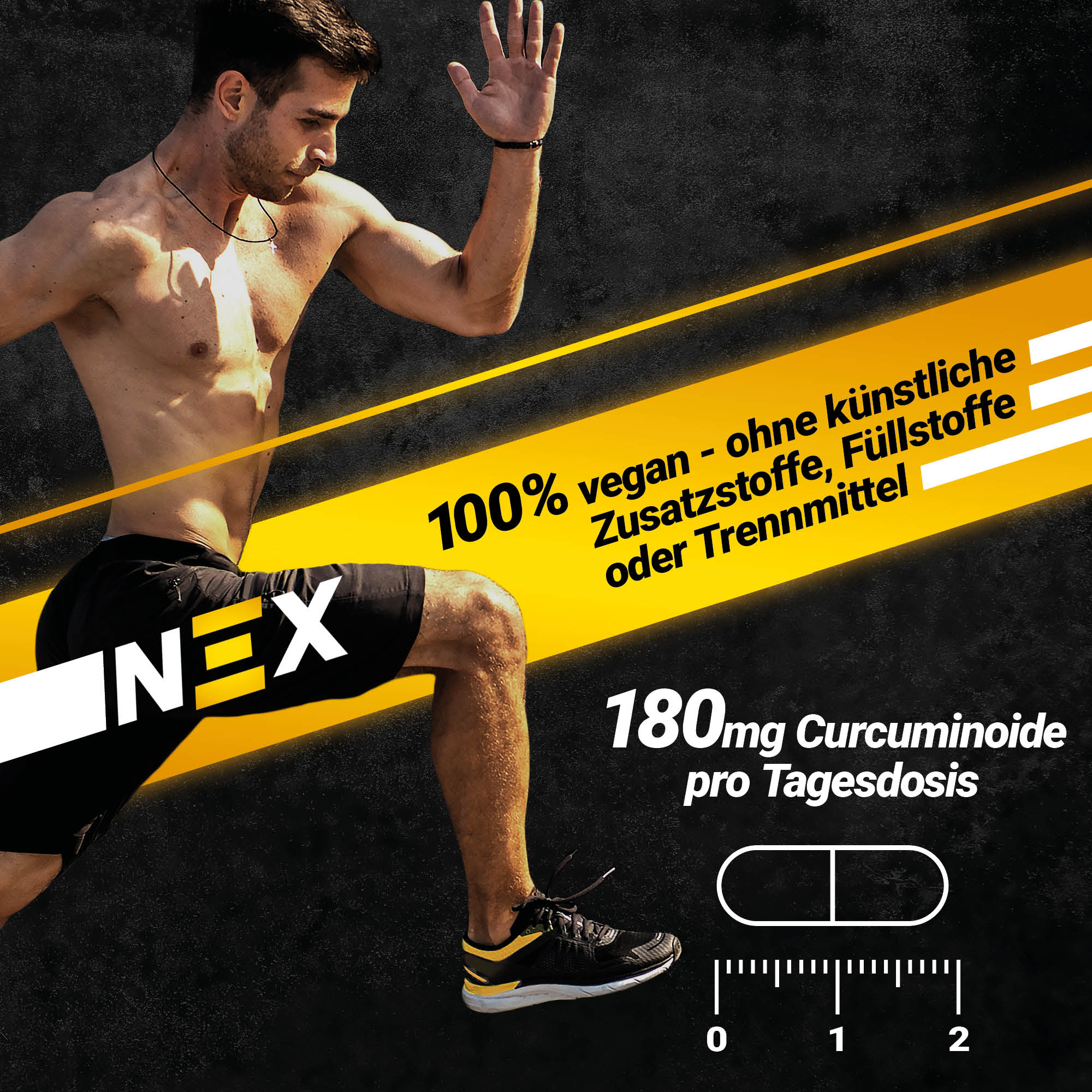 NEX Curcuma Pro liefert dir 180 mg Curcuminoide pro Kapsel in Verbindung mit 2 mg Piperin – kompakt, klar dosiert und einfach in der Anwendung. Die pflanzliche Kapselhülle und der bewusste Verzicht auf Zusatzstoffe machen das Produkt zu einer durchdachten Wahl für deine tägliche Routine.