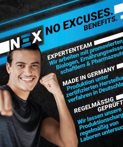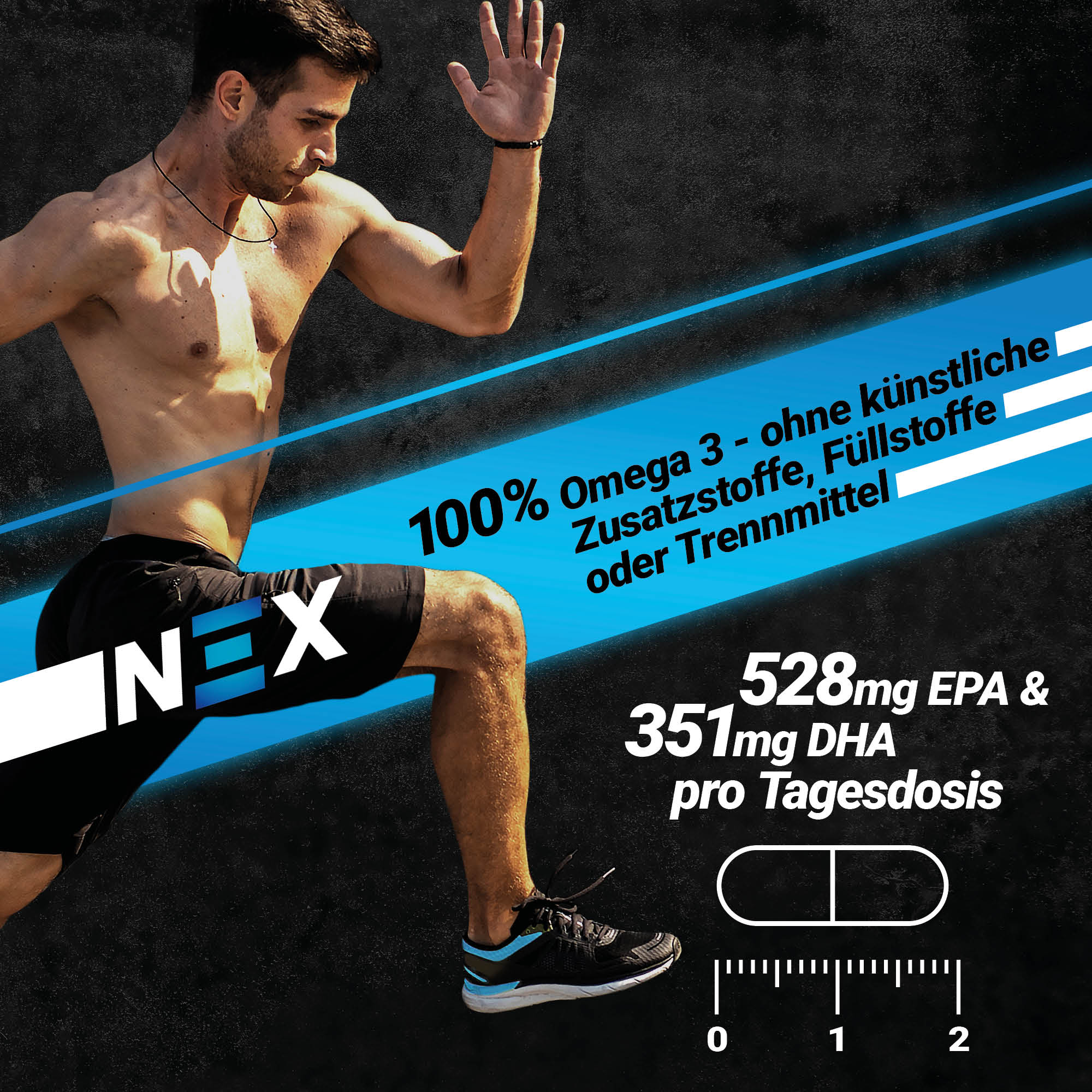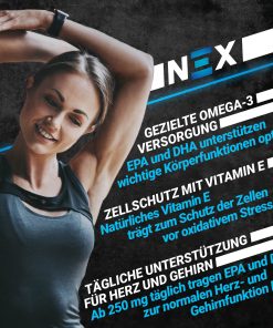 NEX Omega-3 liefert dir täglich 528 mg EPA und 351 mg DHA – ergänzt durch 30 mg natürliches Vitamin E pro 3 Kapseln. Die Kapseln sind leicht einzunehmen und werden ohne künstliche Zusatzstoffe hergestellt – für eine klare, verträgliche Versorgung.