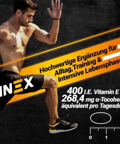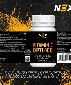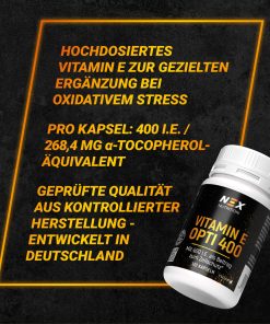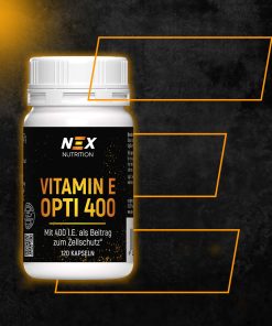 NEX Vitamin E Opti 400 liefert dir 400 I.E. (268,4 mg α-TE) reines Vitamin E pro Kapsel – hochdosiert, geprüft und zuverlässig.