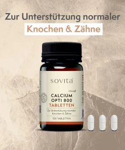 Die sovita Calcium Opti 800 Tabletten sind Ihr zuverlässiger Wegbegleiter für starke und gesunde Knochen. Sie bieten eine hochdosierte und optimal bioverfügbare Form von Calcium, um sicherzustellen, dass Ihr Körper dieses wichtige Mineral effizient aufnehmen kann. Die sovita Calcium Opti 800 Tabletten können vorbeugend oder bereits bei einem Calcium-Mangel eingenommen werden, damit das Gleichgewicht im Körper hergestellt ist. Sie liefern pro Stück 400 mg des wertvollen Mineralstoffes.