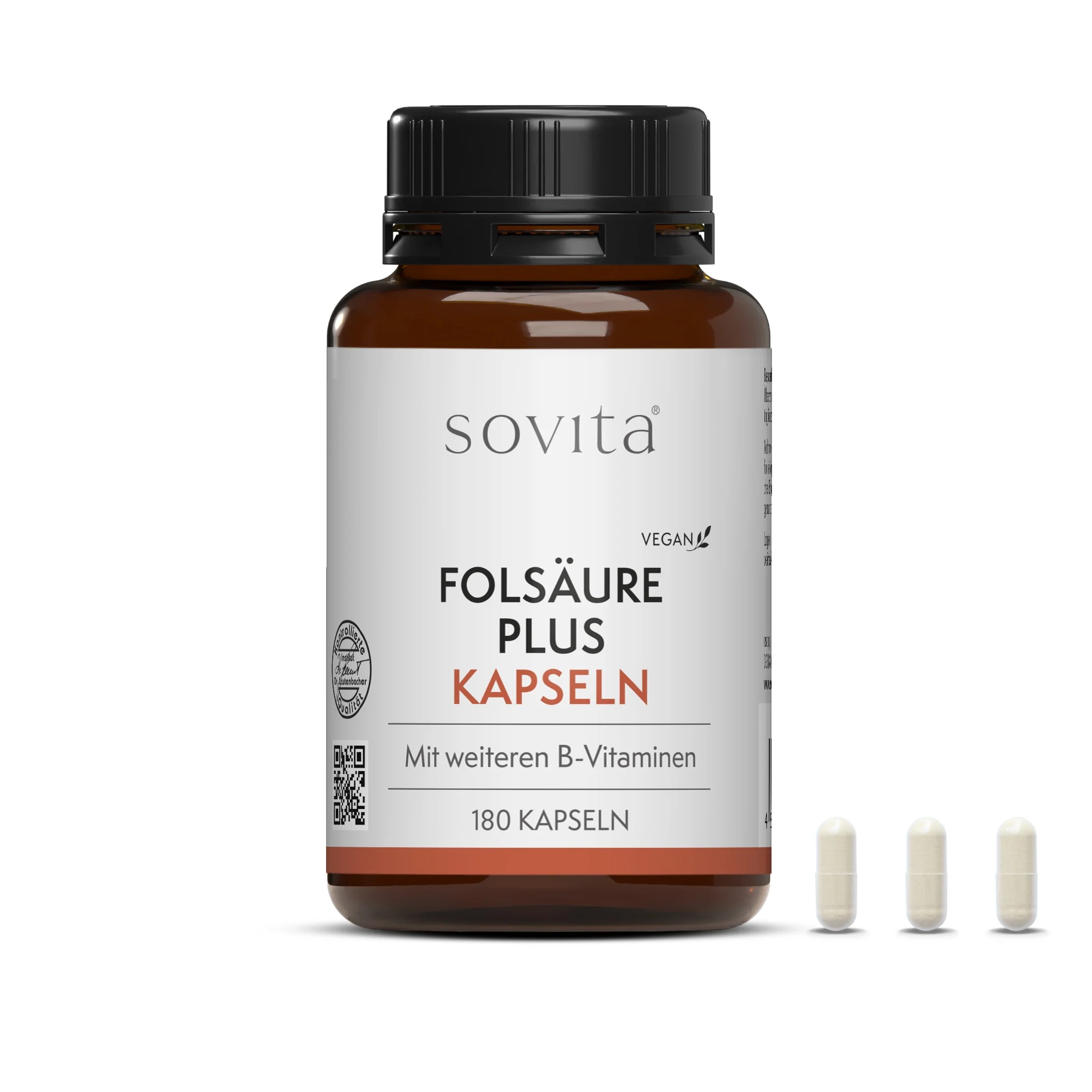 Die Folsäure Plus Kapseln kombinieren drei B-Vitamine, die gezielt zur Versorgung bei erhöhtem Bedarf beitragen – etwa in Schwangerschaft, bei unausgewogener Ernährung oder allgemeiner Erschöpfung1. Die Kombination aus Folsäure, Vitamin B6 und Vitamin B12 ist auf die tägliche Ergänzung ausgelegt und unterstützt zentrale Funktionen im Körper, etwa den Energiestoffwechsel, die Zellteilung oder die Bildung roter Blutkörperchen – mit nur einer Kapsel täglich.