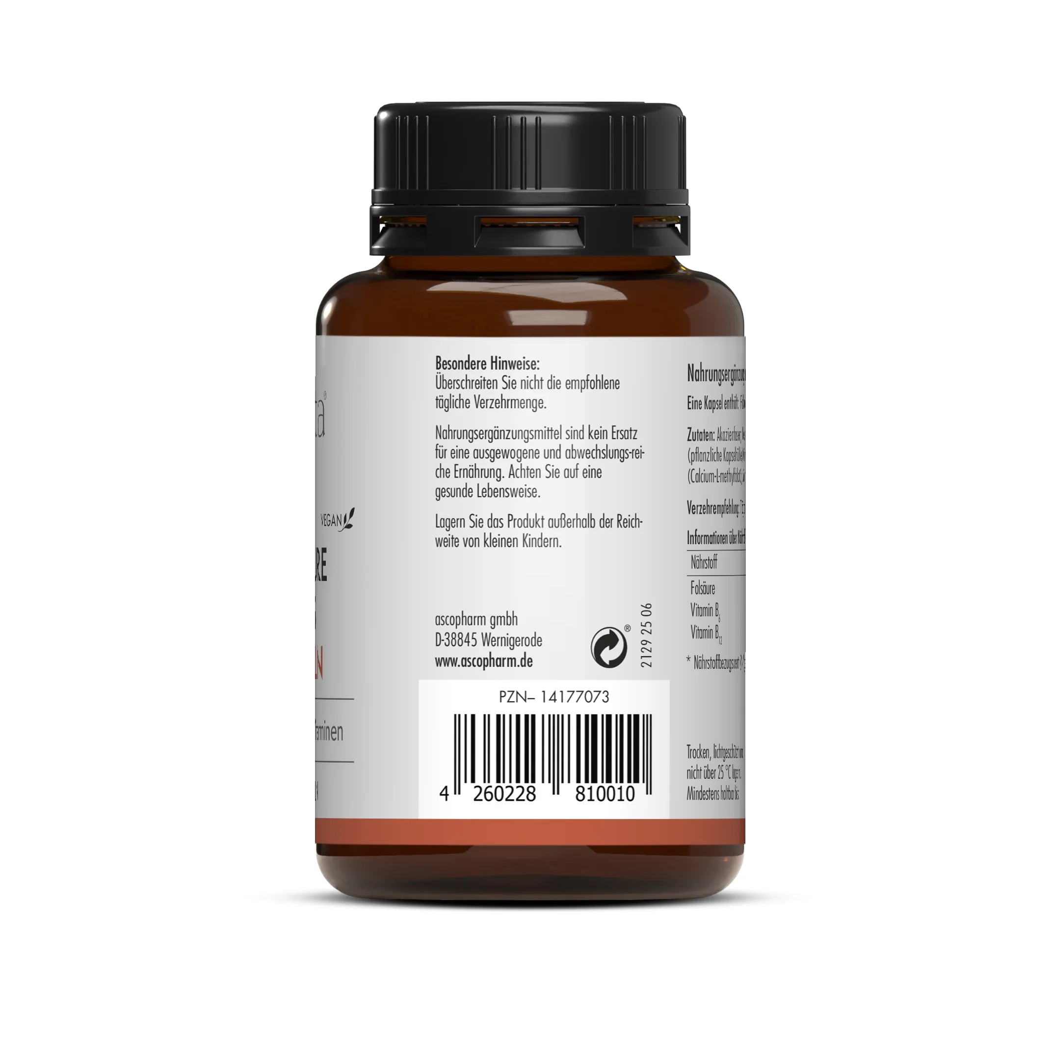 Folsäure 400 µg, Vitamin B6 1,4 mg, Vitamin B12 2,5 μg.