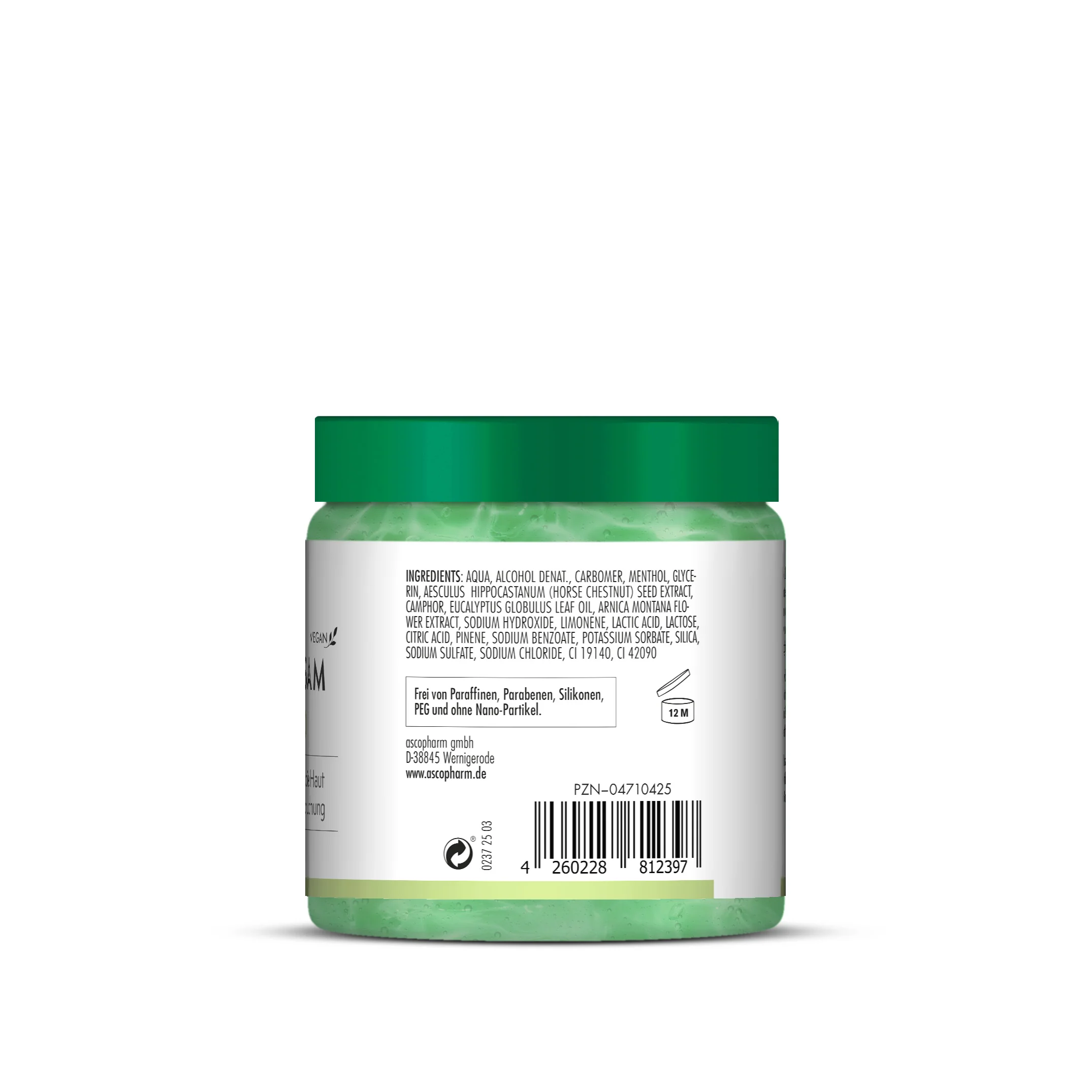 AQUA, ALCOHOL DENAT., CARBOMER, MENTHOL, AESCULUS HIPPOCASTANUM SEED EXTRACT, CAMPHOR, EUCALYPTUS GLOBULUS LEAF OIL, ARNICA MONTANA FLOWER EXTRACT, GLYCERIN, SODIUM HYDROXIDE, LIMONENE, CITRIC ACID, SODIUM BENZOATE, POTASSIUM SORBATE, CI 19140, CI 42090.