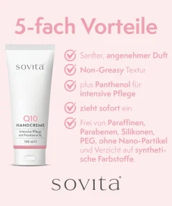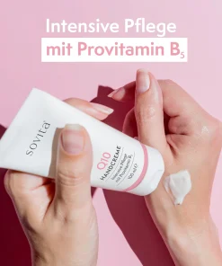 Die sovita Q10 Handcreme ist eine ideale Pflege für strapazierte Haut. Durch die bewährte Formel mit Coenzym Q10 und Panthenol (Vitamin B5) werden Hände und Nägel intensiv gepflegt und widerstandsfähiger gegenüber täglichen Belastungen.