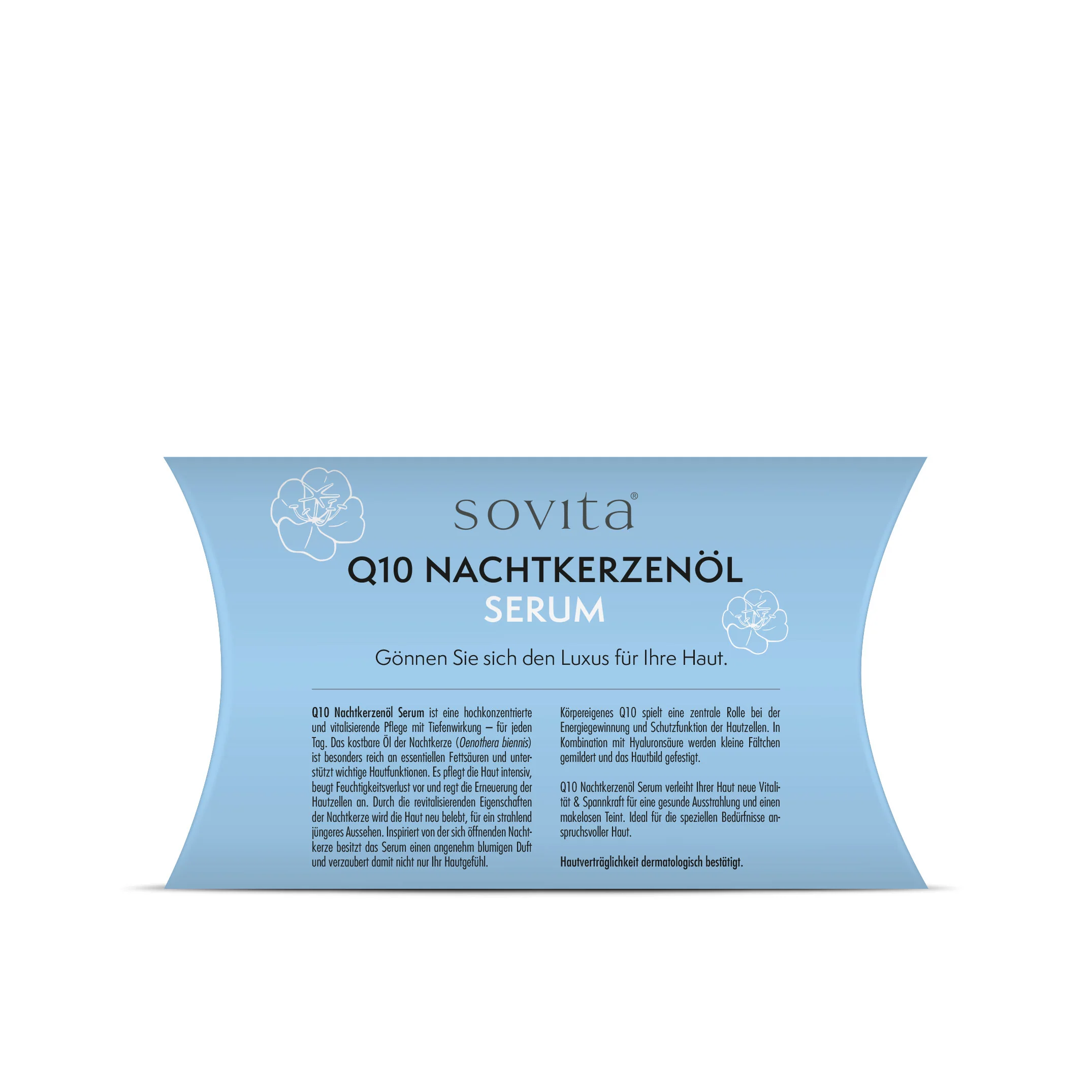 Das sovita Q10 Nachtkerzenöl Serum verleiht Ihrer Haut eine neue Vitalität und Spannkraft, was zu einer gesunden Ausstrahlung und einem makellosen Teint führt. Es ist die ideale Pflege für anspruchsvolle Haut, weil es Nachtkerzenöl, Vitamin E und wertvolle Pflanzenextrakte aus Salbei, Kigelia africana, Rotklee, Hopfen und Frauenmantel zu einer hochwirksamen Intensivpflege kombiniert. Bei regelmäßiger Anwendung wird die natürliche Schutzfunktion Ihrer Haut aktiviert und die Zellerneuerung stimuliert. Die leichte Textur zieht schnell ein und hinterlässt ein angenehmes Hautgefühl, ohne die Poren zu verstopfen. Ihre Haut fühlt sich genährt und geglättet an, und Ihr Teint wirkt ebenmäßig und strahlend.
