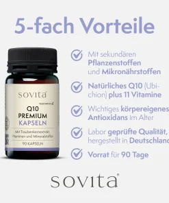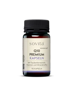 Q10 Premium Kapseln kombinieren Coenzym Q10, Traubenkernextrakt (OPC), Vitamine und Mineralstoffe, die an zahlreichen biologischen Prozessen beteiligt sind. Coenzym Q10 ist eine körpereigene Substanz, die in den Mitochondrien, den „Kraftwerken“ der Zellen, vorkommt. Der enthaltene Traubenkernextrakt liefert OPC (Oligomere Proanthocyanidine), pflanzliche Verbindungen, die in vielen Lebensmitteln vorkommen.