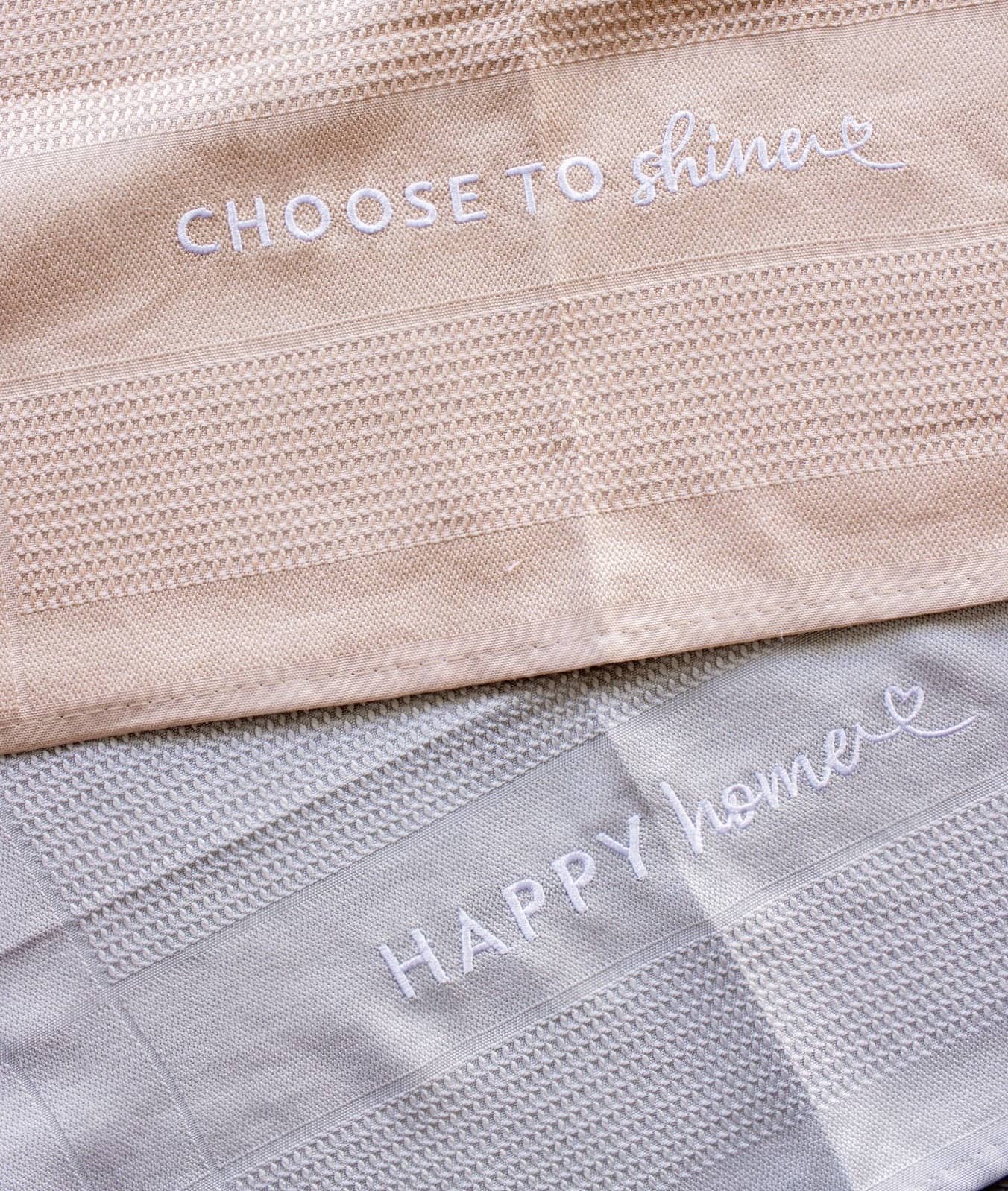 - Set 2: beige mit Spruch „Choose to shine“ und hellgrau mit Spruch „Happy Home“