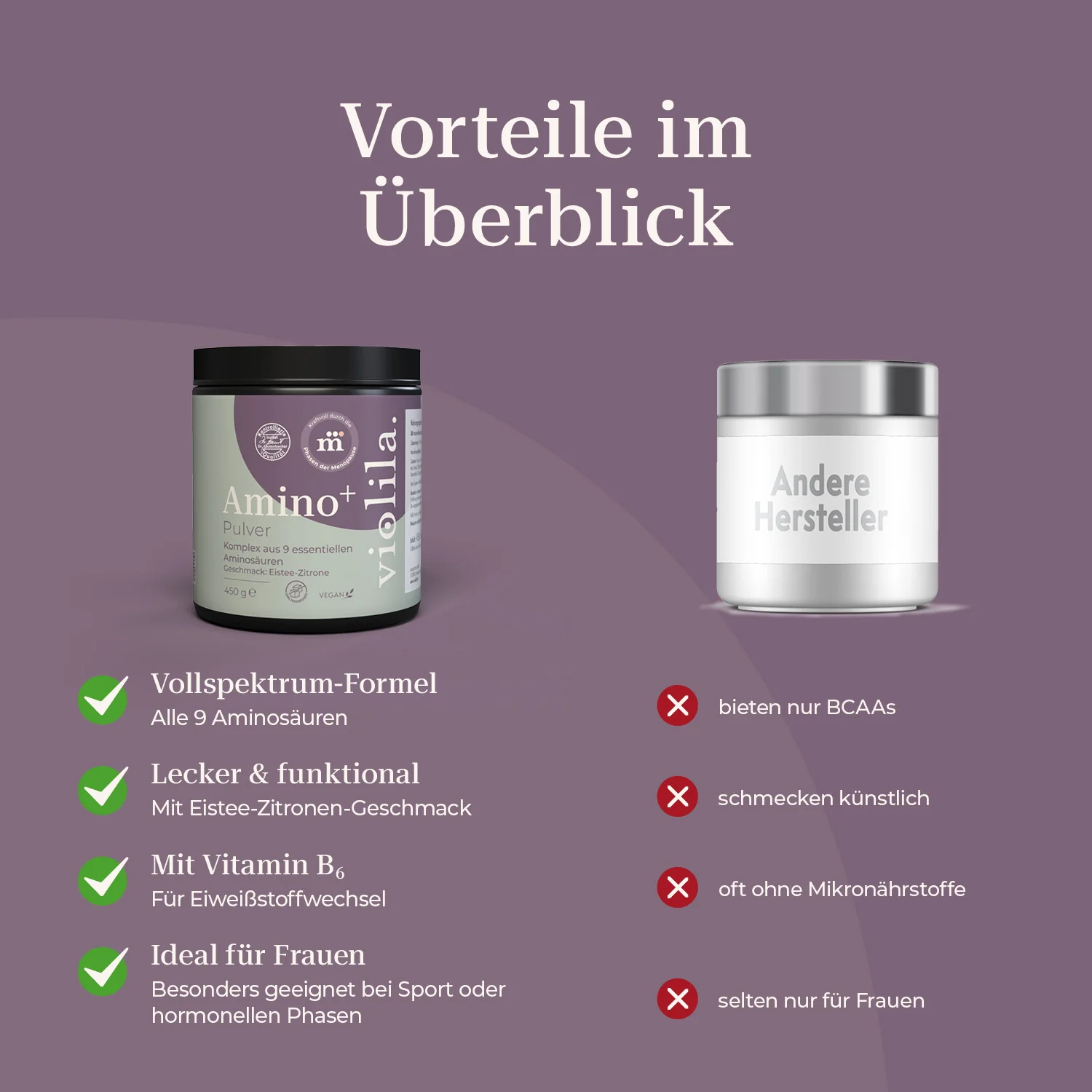 In körperlich oder hormonell fordernden Phasen – z. B. in den Wechseljahren oder bei regelmäßigem Training – kann der Bedarf an bestimmten Aminosäuren steigen. Amino⁺ liefert ein vollständiges Spektrum essenzieller Aminosäuren in Kombination mit Vitamin B6 – vegan, alltagstauglich und lecker.