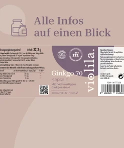 Die violila Ginkgo 70 Kapseln enthalten einen hochwertigen Ginkgo biloba Extrakt mit einem Gehalt von 70 mg Ginkgoblatt-Trockenextrakt (50:1). Dieser pflanzliche Extrakt wird seit Jahrhunderten in der traditionellen chinesischen Medizin geschätzt. Mit den Ginkgo Kapseln erhalten Sie ein hochwertiges Nahrungsergänzungsmittel.