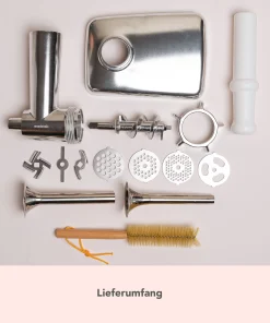 - Umfangreiches Zubehör: Schneidemesser, Wurstfüller und Reinigungsbürste erleichtern Dir die Zubereitung und Reinigung. Nicht spülmaschinengeeignet.