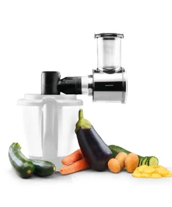 - Gleichmäßige Stücke: Schneide größere Gemüsestücke in gleichmäßige Teile, damit der Aufsatz effizient arbeitet.