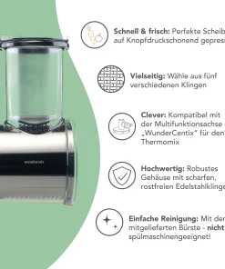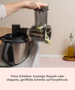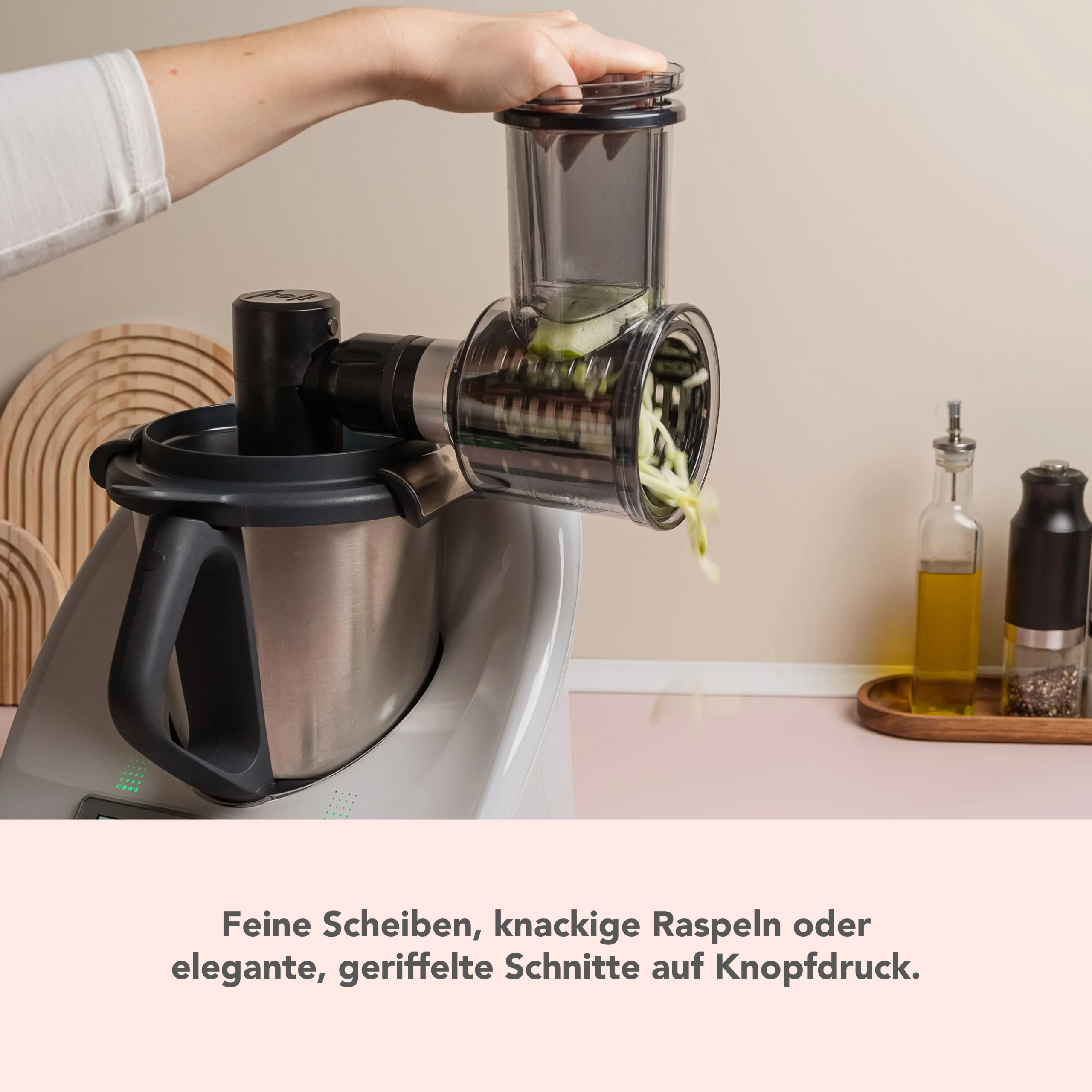 Mit dem WunderCentix und dem vielseitigen Gemüseschneider-Aufsatz hast Du die Möglichkeit, Gemüse in verschiedenen Formen zu schneiden: Feine Scheiben, knackige Raspeln oder elegante Wellenstreifen – alles nach Deinen Wünschen. Perfekt für schnelle Gerichte oder schöne Salate und ausgefallene Bowls. So gelingt jede Gemüsezubereitung im Nu – präzise und mühelos.