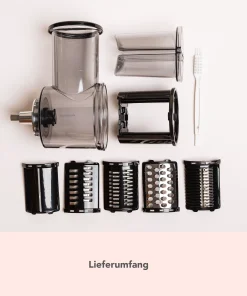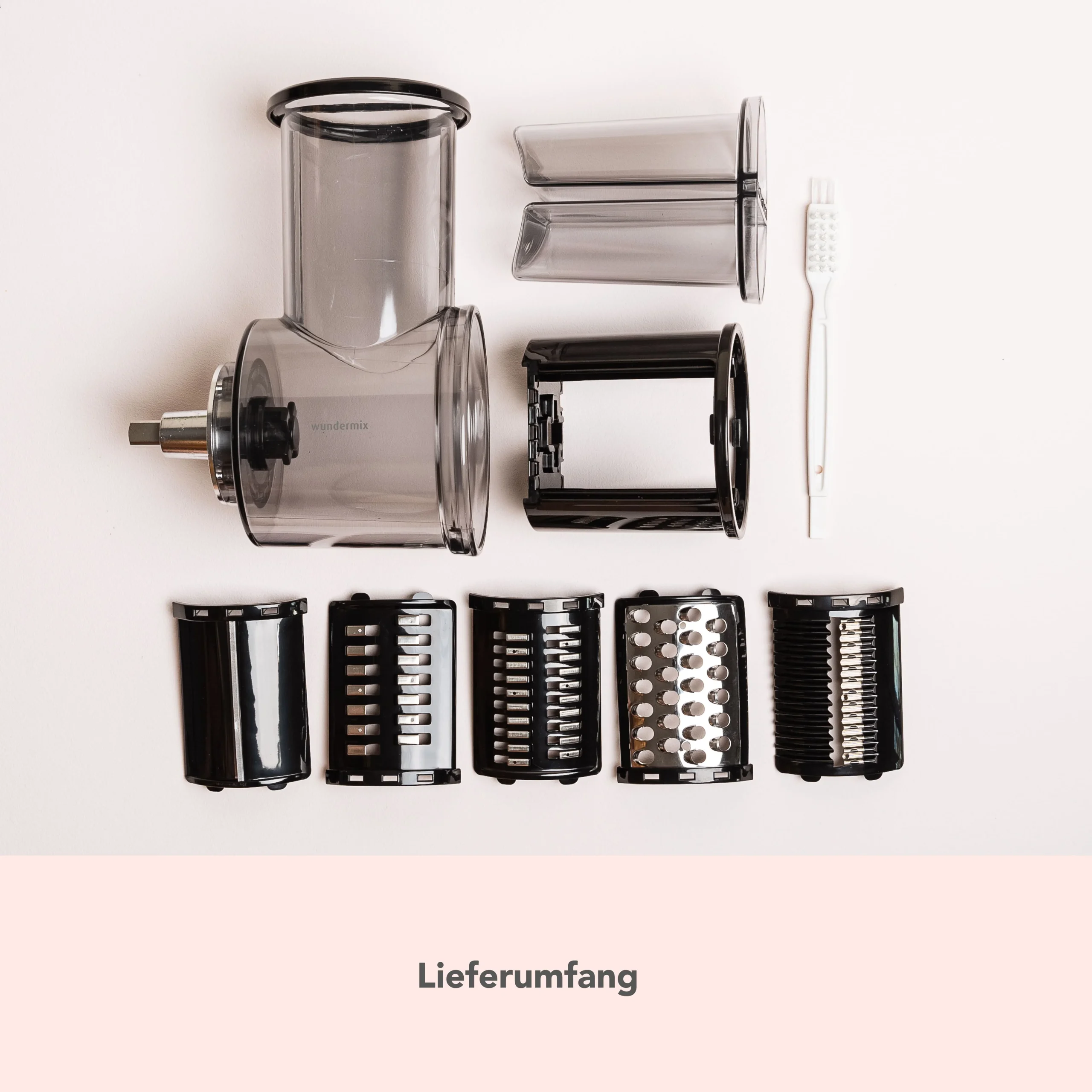 Im Lieferumfang enthalten sind: WunderCentix Multifunktionsachse, Gemüseschneider mit fünf Klingen und Reinigungsbürste