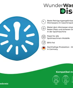 Deshalb haben wir die WunderWash Disc entwickeln lassen. Das Mixmesser wird einfach in die Disc gesteckt und diese dann zwischen die Spülstäbe für die Teller gestellt.